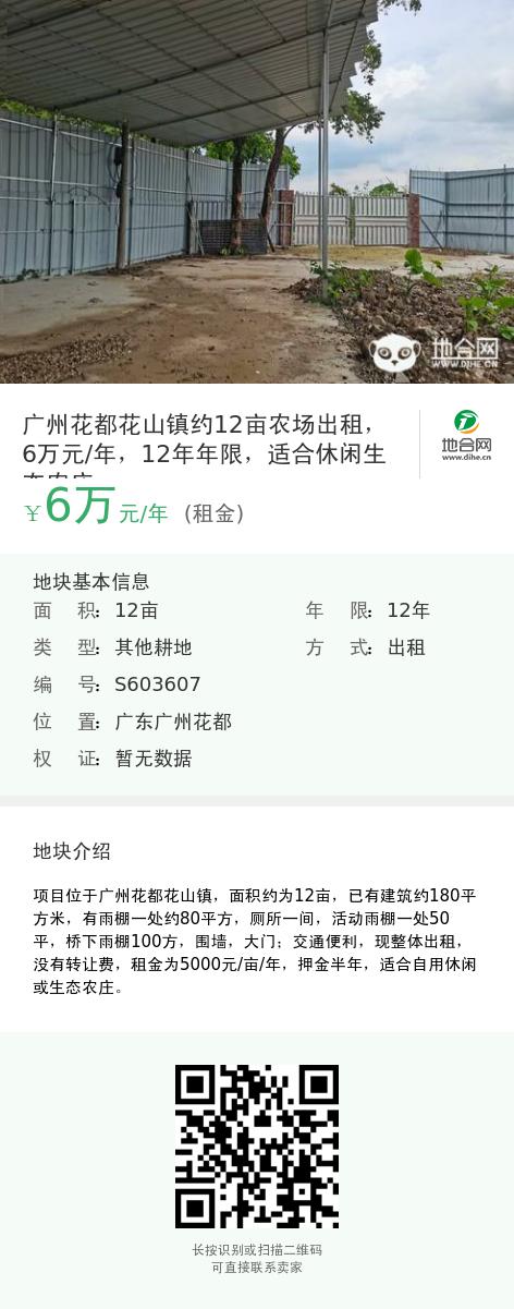 项目位于广州花都花山镇,面积约为12亩,已有建筑约180平方米,有雨棚一处约80平方,厕所一间,活动雨棚一处50平,桥下雨棚100方,围墙,大门;交通便利,现整体出租,没有转让费,租金为5000元/亩/年,押金半年,适合自用休闲或生态农庄。
